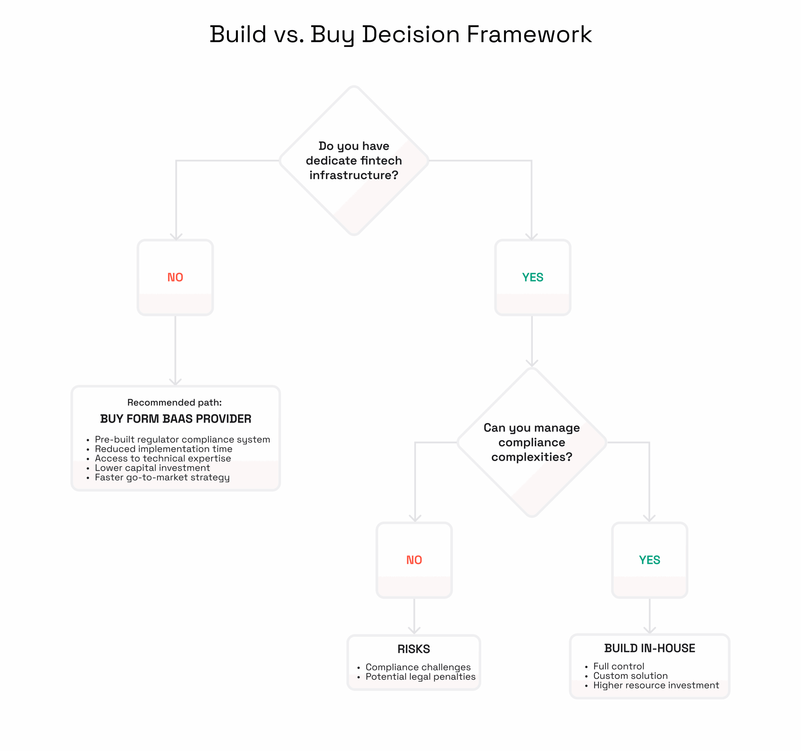 Determine whether your in-house team will handle the financial fintech infrastructure development. A BaaS platform is better because it provides custom, iterative, and fast solutions.