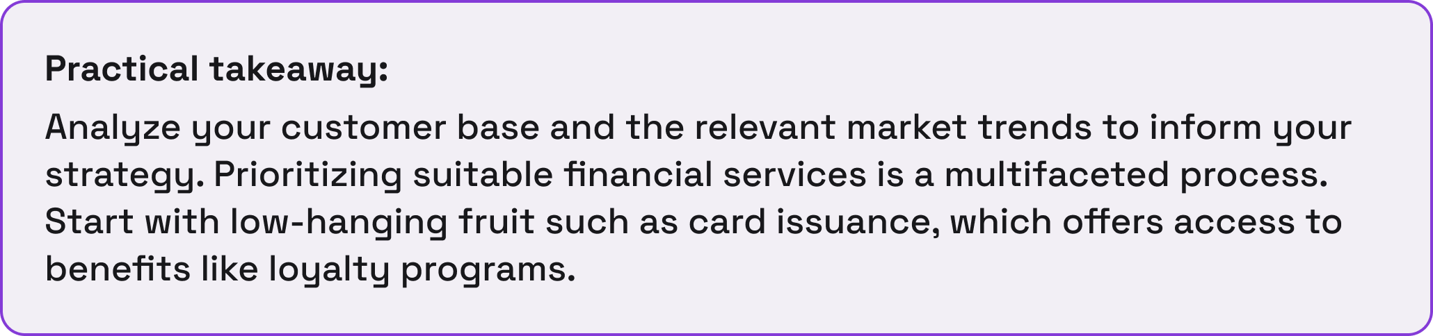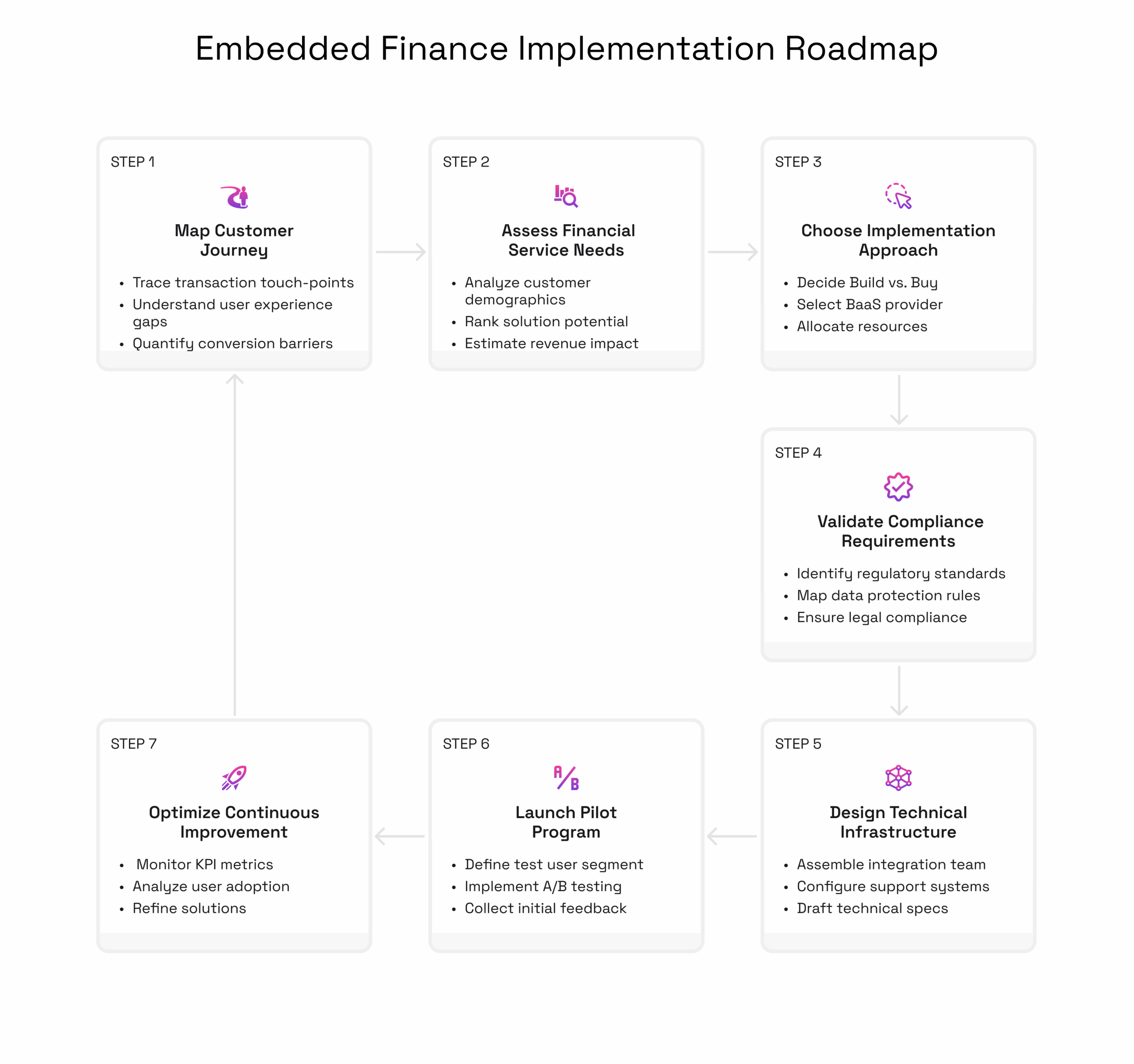 - Scoping: Identify the relevant embedded finance solutions you must implement. Rank them based on customer demand and potential revenue.
