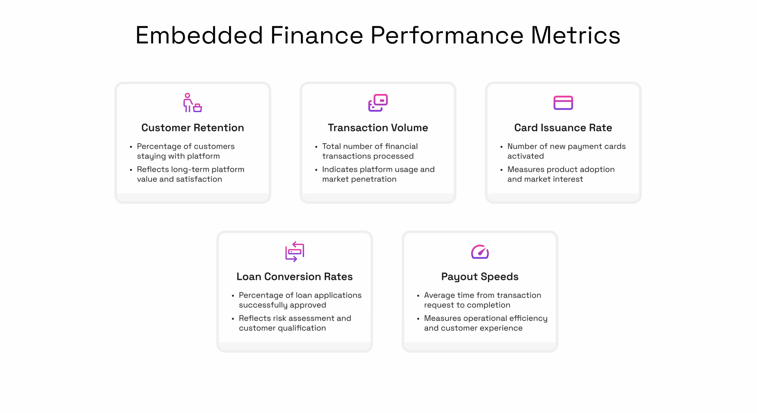 The ideal measurement framework involves evaluating the system's performance. Evaluate the metrics that are relevant to the financial solutions you have offered. For instance, the transaction volume or card issuance rate in your service over time. Measuring success for your business will also involve loan conversion rates and payout speeds.