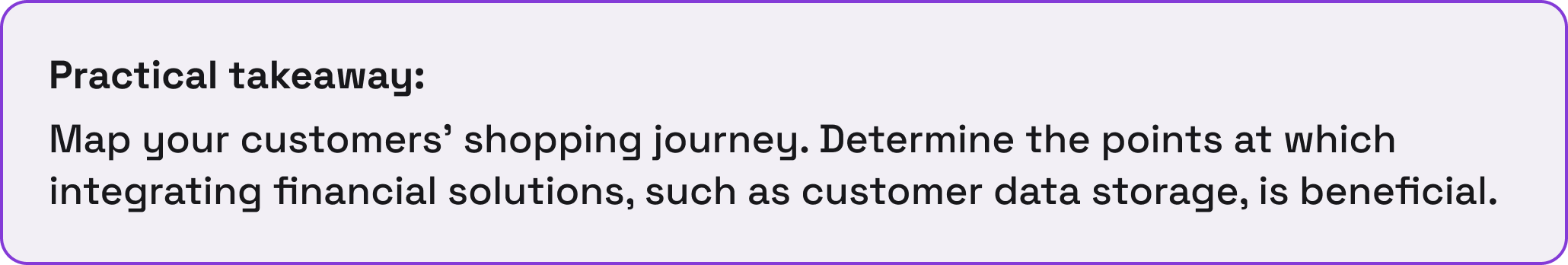 You must map out your customer's shopping or purchase journey. Identify strategies to address any challenges that arise during the payment and financing processes. Embedded finance solutions will be ideal in such situations. According to a consumer survey, 56% of consumers, predominantly millennials and digital-first shoppers, reported that storing payment credentials directly with merchants significantly improves their online checkout experience and transactional convenience [2].