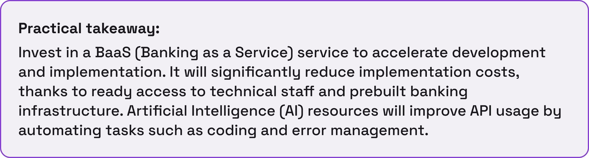 You must decide whether to develop a financial API in-house or invest in a BaaS (Banking as a Service) provider. Without the right resources, building takes a long time and requires significant capital investment. It also exposes your company to various compliance challenges, compromised system development cycles, and essential technical debt.