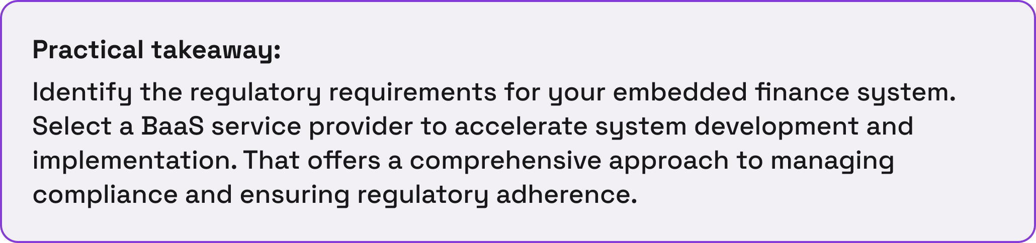 - Compliance: Identify all regulatory requirements relevant to your system's operations. Please share them with your preferred BaaS before system development.