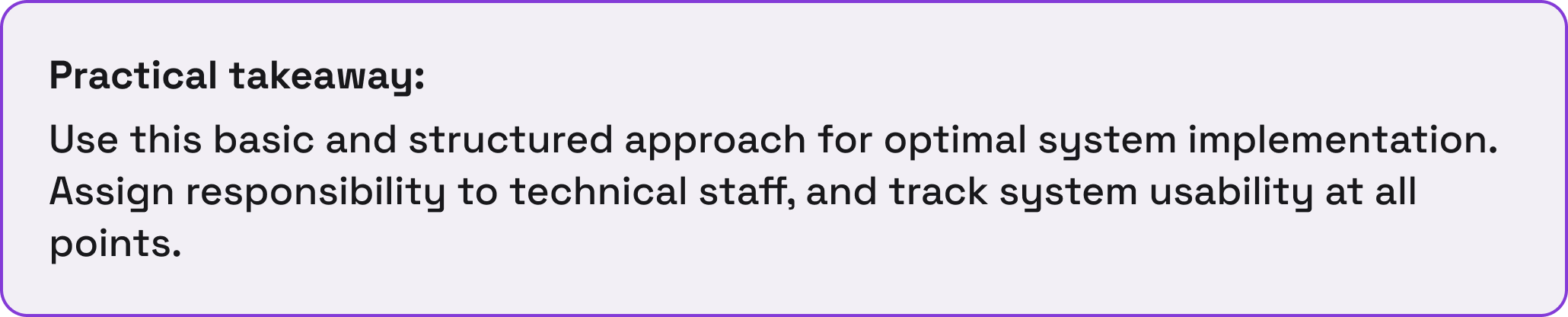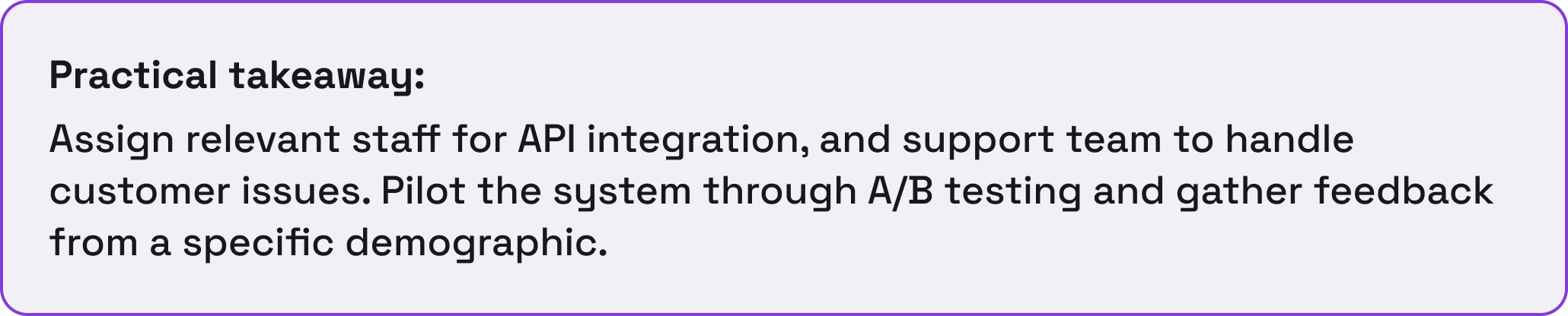 - Integration: Assign trained and technical staff for this process. Also set up customer support teams to track any usability challenges.
