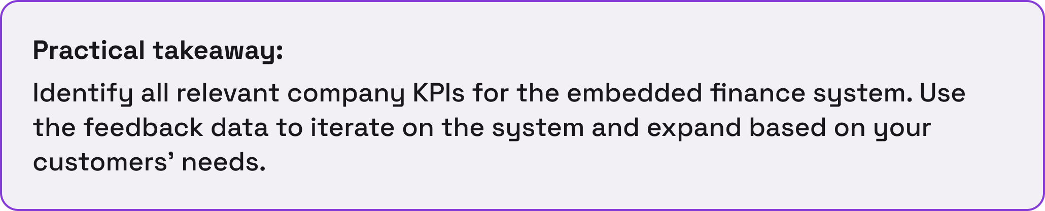 While embedded finance systems are beneficial, using them correctly requires data-driven iteration. You must track Key Performance Indicator (KPI) metrics that are relevant to the system's performance.