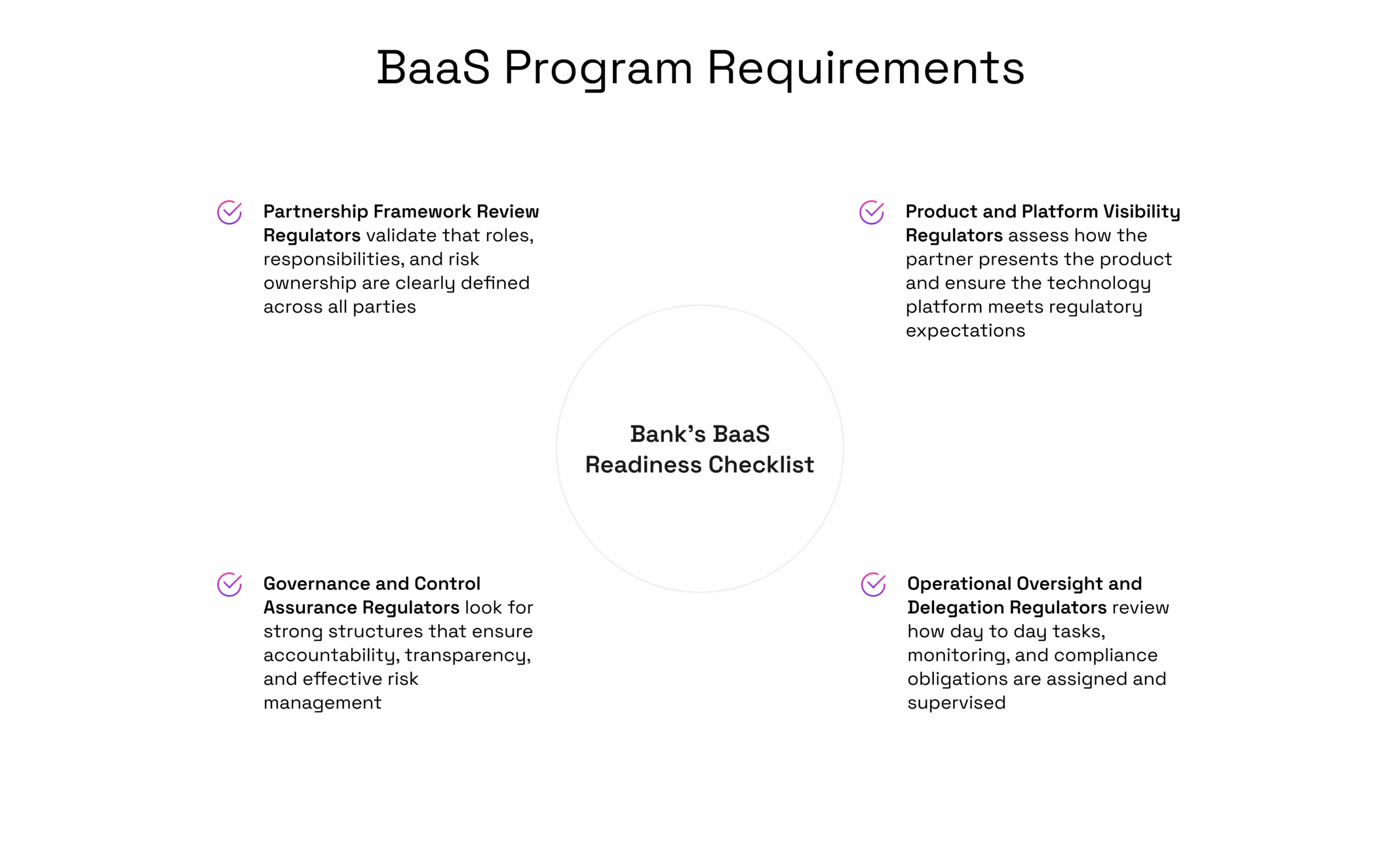 - The regulator will probably want to see your partnership agreement with the technology vendor and your BaaS business partners. This is where all critical details on roles and responsibilities are set out.